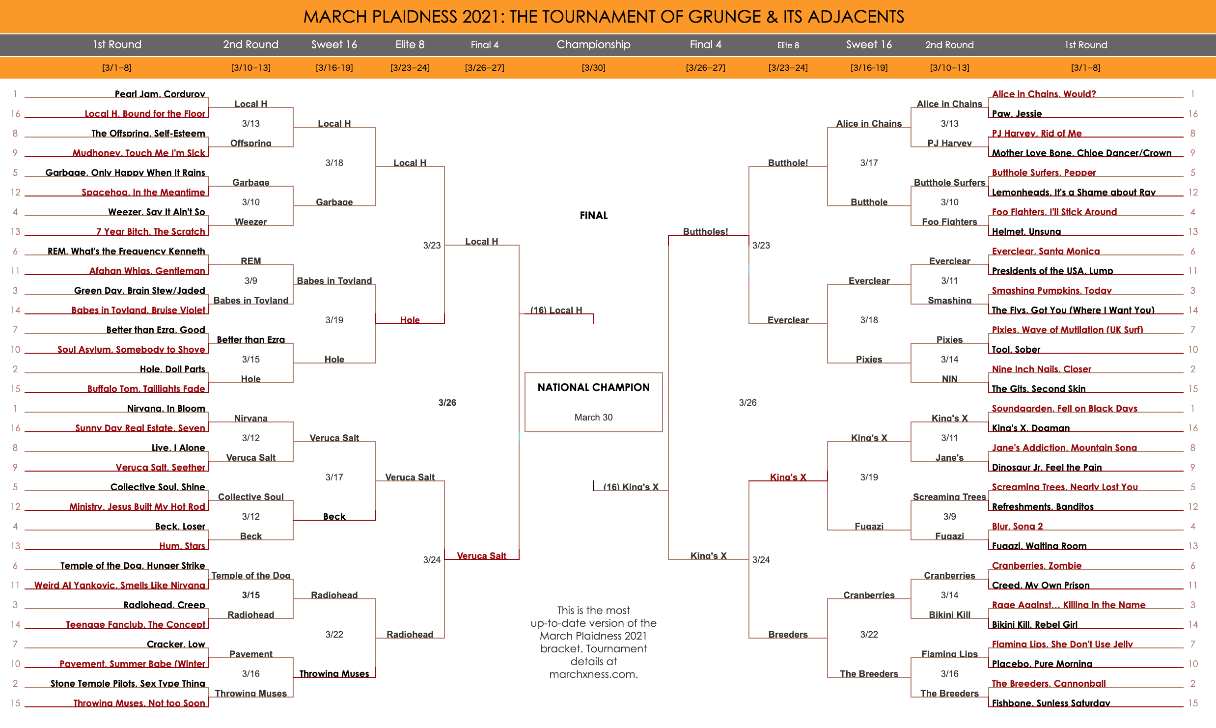 If you’re new to March Xnesses, we run an actual March Madness-style tournament every March. This year’s theme is the grunge era.