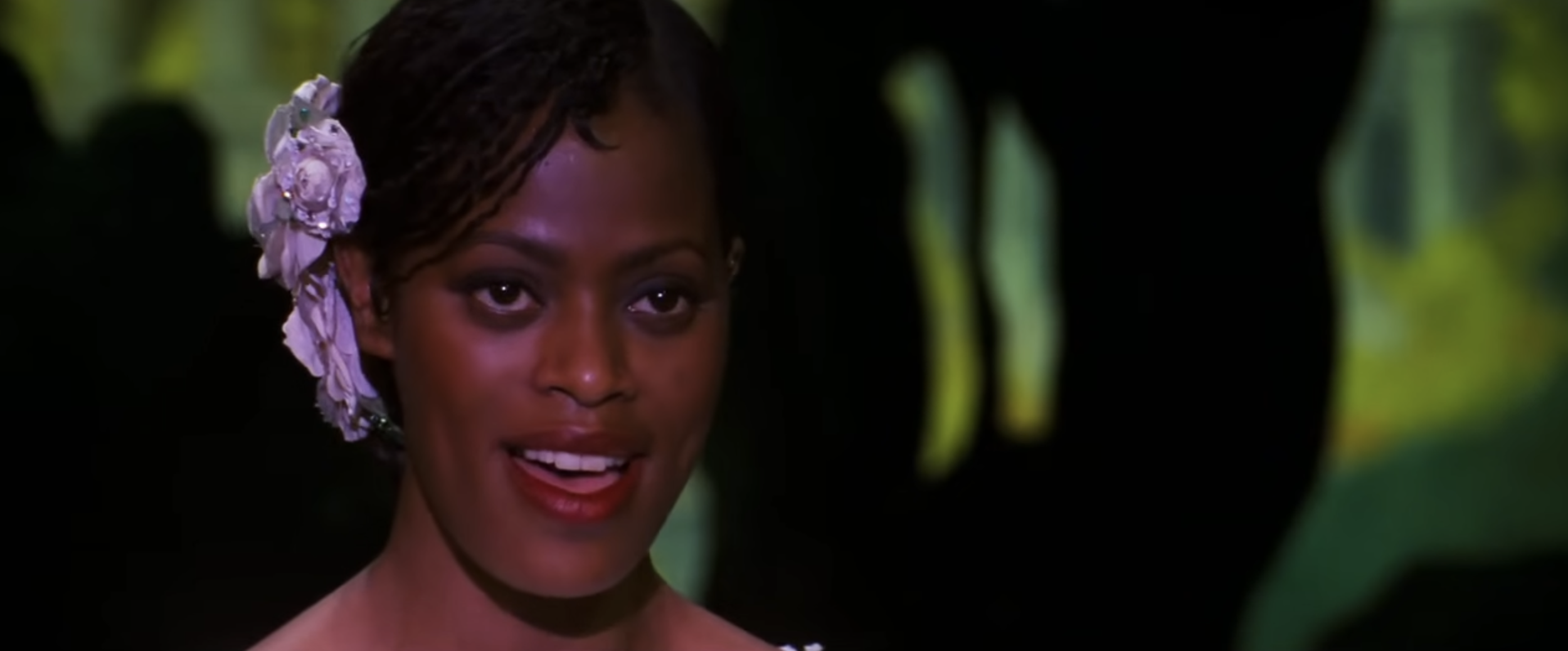 In her twelve-second cameo as “Diva,” she appears on stage wearing a sleek white crochet dress, performing at the Capulets’ masquerade party. In a close-up shot, her braids are pulled away from her face, clipped to side by lavender roses. Instead of looking directly into the crowd, she fixes her gaze on the back of the ballroom. The piano is the only instrument that accompanies her deep contralto. All the partygoers go silent, listening to a voice that clearly belongs to a virtuoso singer.